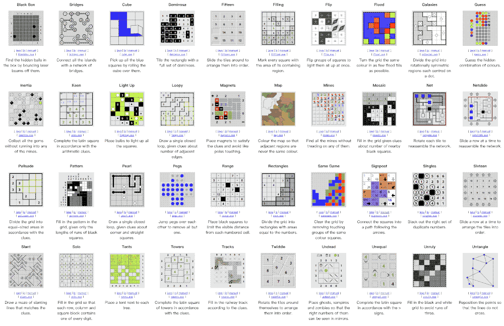 "I wrote this collection because I thought there should be more small desktop toys available: little games you can pop up in a window and play for two or three minutes while you take a break from whatever else you were doing. And I was also annoyed that every time I found a good game on (say) Unix, it wasn't available the next time I was sitting at a Windows machine, or vice versa; so I arranged that everything in my personal puzzle collection will happily run on both those platforms and more."