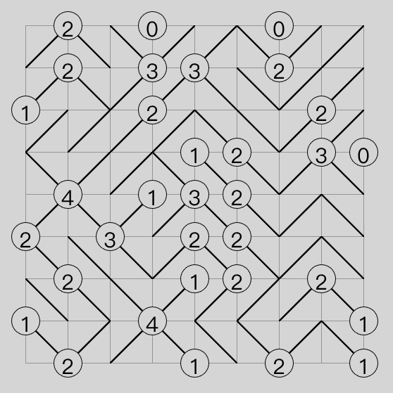 Slant。在每個方格裡畫一條對角線(左斜或右斜),讓每個交叉點的數字,剛好等於在那裡交會的線條數,而且所有線條不能形成封閉迴圈。