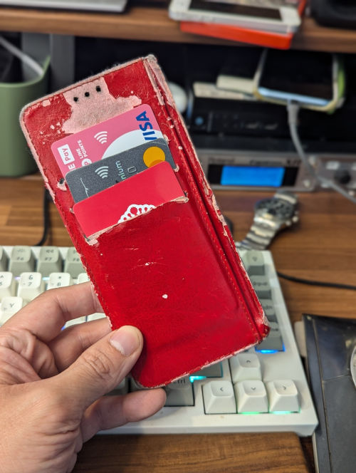 隨便舉例。我現在用的卡套,是從之前壞掉的手機殼割下來的。那原本是一個皮套式的掀蓋手機殼,就是那種打開像小皮夾、內側可以插卡的款式。後來手機殼的那一半斷了,我就拿刀片把卡套的那一半切下來,繼續單獨當卡套用。