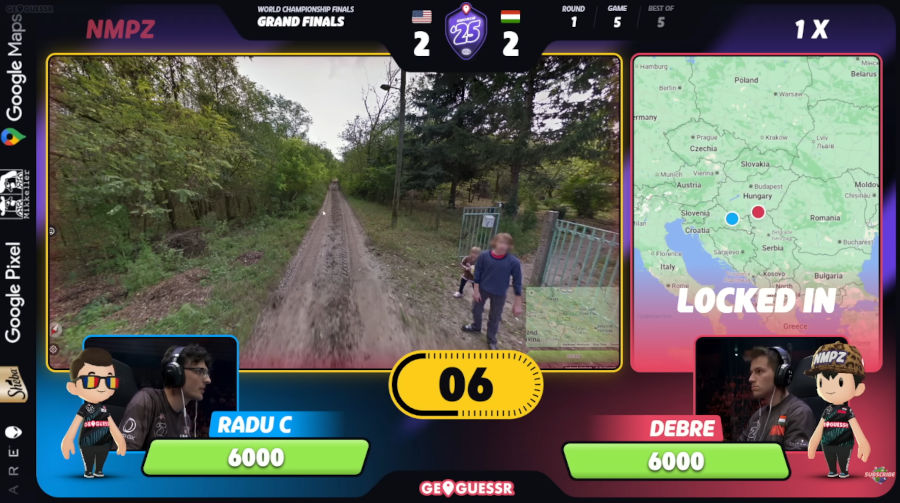 - 如果前四局打成 2-2 平手,就會進到決戰的 Game 5:「NMPZ 模式」。NMPZ 的意思是「不能移動、不能轉頭、不能縮放」(No move, no pan, no zoom)──就是只看一張靜態圖,一分鐘內回答這是地球上的哪裡。