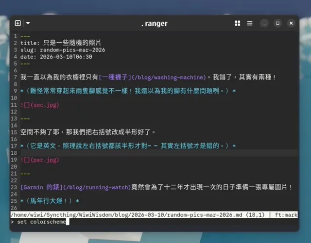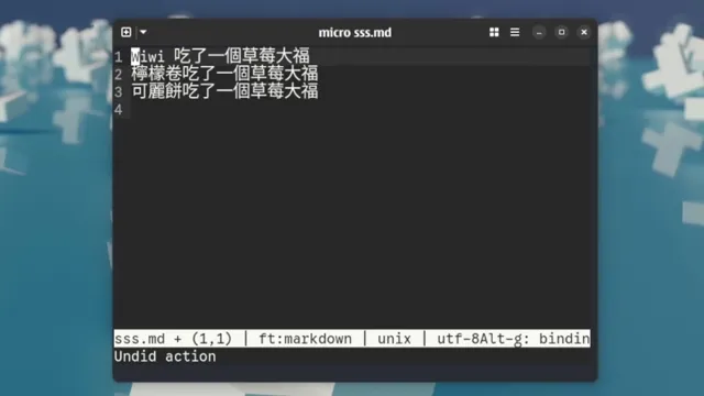 Micro 是一個在終端機裡執行的純文字編輯器。它絕對是我電腦上使用時間最長的軟體──我以前還會開 Obsidian、Typora、Zettlr、VS Codium 之類的圖形介面編輯器,現在幾乎都不用了。