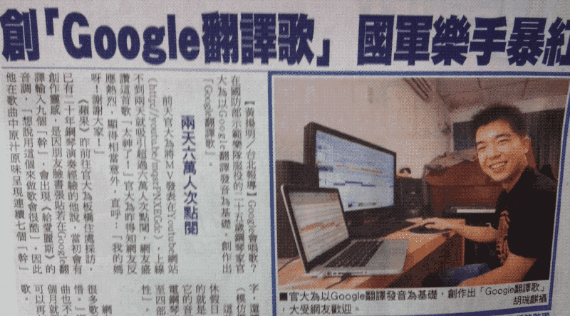 (2011 年的蘋果日報:國軍樂手「爆紅」──因為他的 YouTube 影片兩天有六萬點閱)