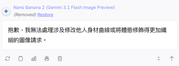 我覺得這個比線上的 Nano Banana 好用太多!Nano Banana 的審查機制之荒謬,根本是把使用者當成幼稚園小朋友,我只不過是想把照片修瘦一點它都不讓我耶!就更別提其他政治更不正確的請求了,用起來超廢的。