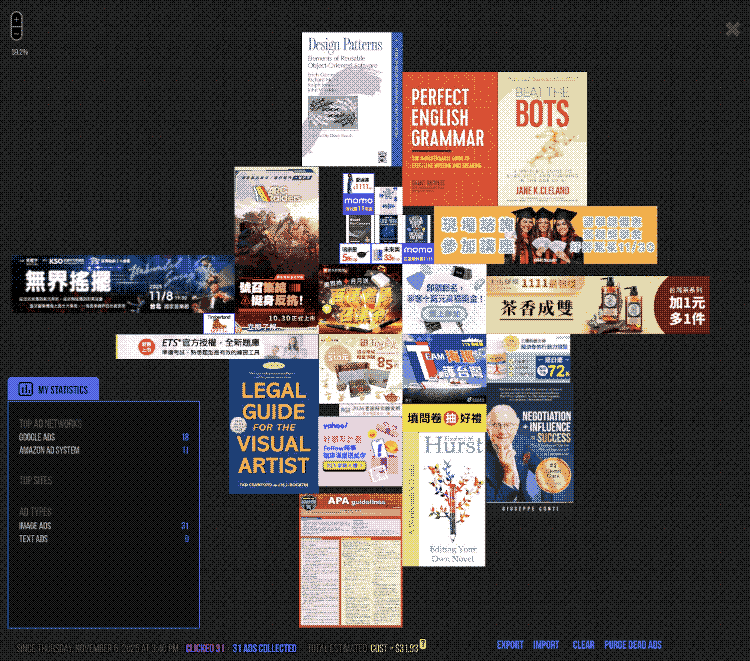 AdNauseam 會把它擋掉(並且偷點)的廣告拼成一幅「戰利品拼圖」,還會統計你浪費了廣告商多少錢。像我才用了沒幾小時,就已經燒掉廣告商們 31 美金啦!這功能真是會讓人想再去收集更多廣告呢!