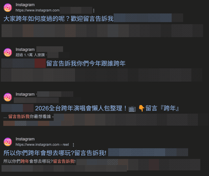 這些問句的真正功能,是真心地想知道大家的跨年計畫,還是只想把留言數衝高,讓演算法判定這篇貼文互動性很高呢?
