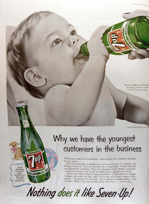 1950 年代,七喜(7-UP)汽水的廣告4放了一張嬰兒照片,得意地說:「這位小帥哥才 11 個月大,但他還不是我們最年輕的顧客喔!」。