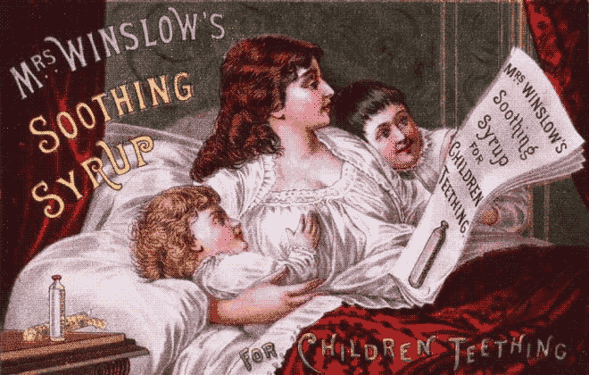 溫斯洛夫人舒緩糖漿(Mrs. Winslow's Soothing Syrup)在 1845 年上市,一直到 1930 年都還在賣。廣告文案說能幫助寶寶「緩解 長牙疼痛」、「調節腸胃」、「促進自然睡眠」。