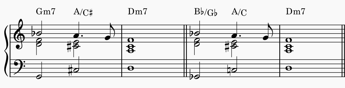 這兩個和弦是我在阮黎(Nguyên Lê)的 Isoar 這首曲子裡聽到的(YouTube 連結)。它們完全違反我的常識,因為依照正常寫法,這邊應該要放 Gm7 和 A/C# 才對,但他卻硬是把低音直接再降半音,變成 Bb/Gb 和 A/C!
