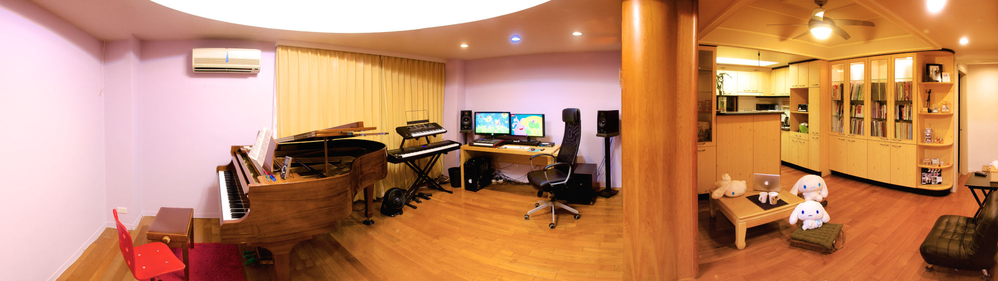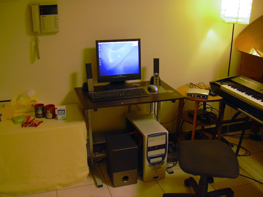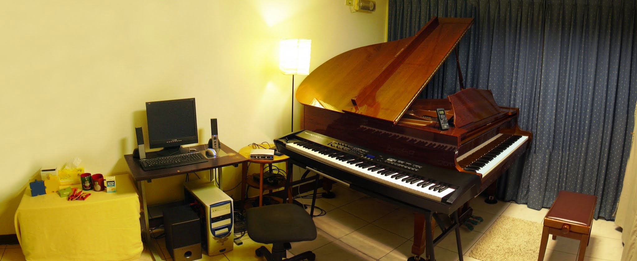 這個 12 坪的空間相當簡陋,照片畫面外的右方(彈鋼琴時背後的方向)就是我的床舖,沒有隔間,只是用簾子象徵性地遮一下(連簾子都只是用鋼絲掛的,還會有點垂下來)。