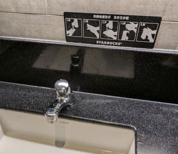 我後來去拍了「當事水龍頭」的照片了。諷刺的是,旁邊貼的「濕搓沖捧擦」五個步驟中,有三個你無法用這個水龍頭做到。