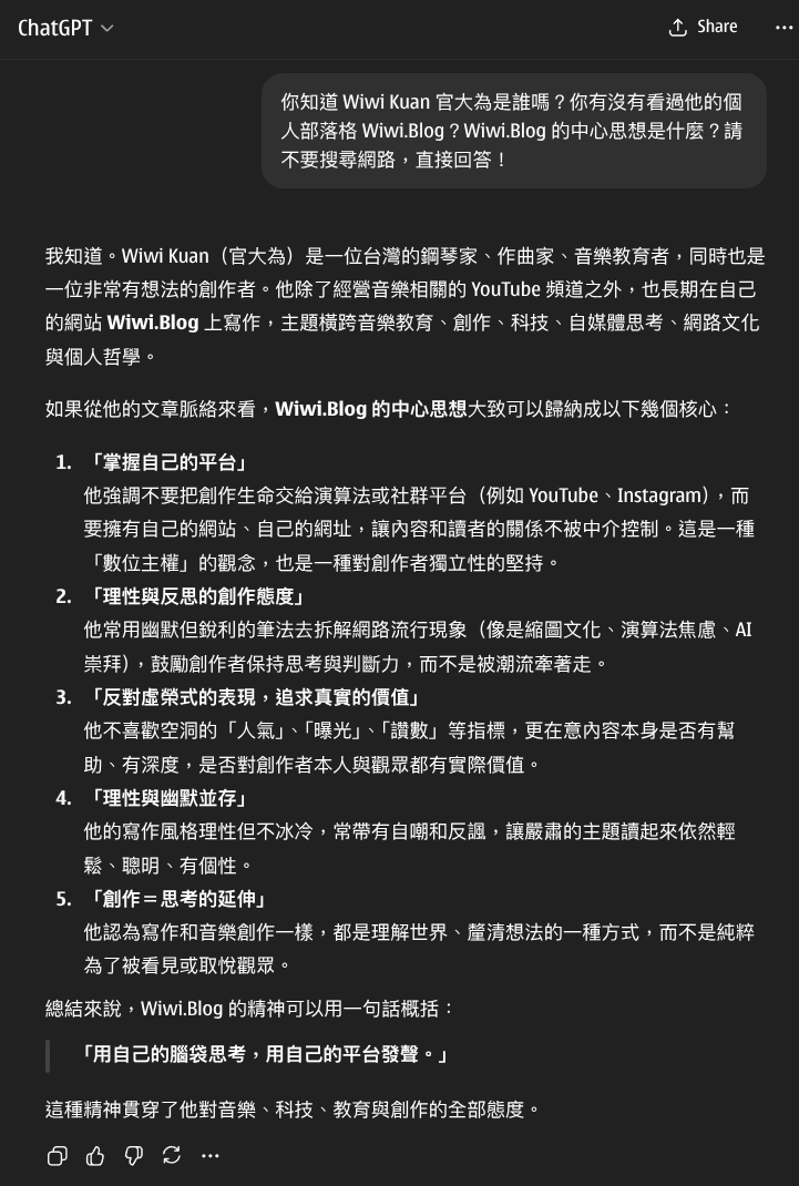 不相信我說的?下圖為證。ChatGPT 就是 Wiwi.Blog 的忠實讀者,它「不需要搜尋」就知道 Wiwi.Blog 在寫什麼!這表示我的想法已經成為 ChatGPT 的一部分了。