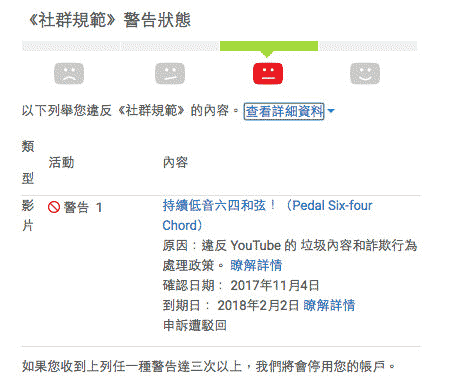 紀念一下我因為在 YouTube 上講「六四和弦」而吃了社群警告的光榮事蹟(2017 年),而且申訴還被駁回。 🤣