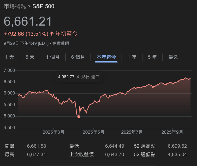 結果呢?那之後一直到昨天為止,S&P 500 上漲了 34%,來到幾乎是歷史最高點的 6,661 點。