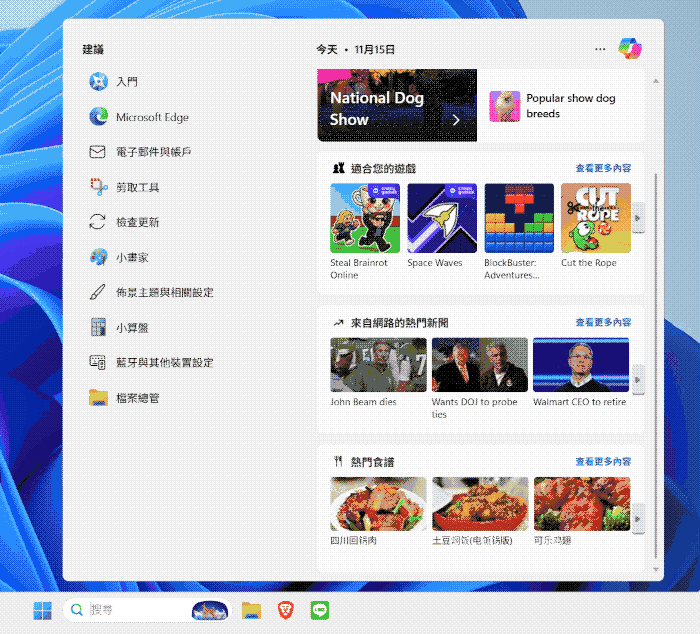 (Windows 11 的搜尋欄,按下去會跳出這個視窗:左半部是沒用的「建議」,右半部都是廣告。「熱門食譜:四川回鍋肉」到底干我 P 事啊!)